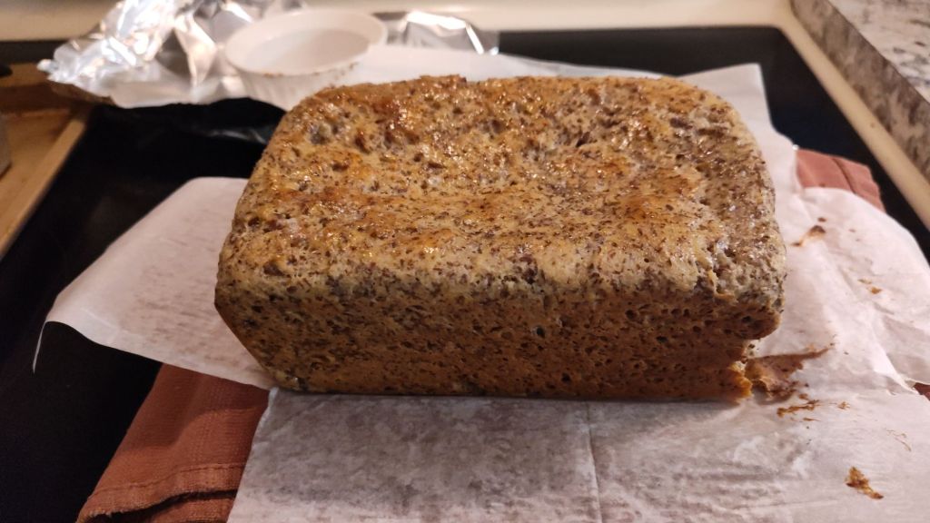 This bread did not go as planned. I have a recipe for it, which I’ll post at the end of this post. But I don’t want to post it at the beginning because I don’t want somebody to come along and follow the recipe and think it’s going to work. Because it didn’t work. There was a lot of modification that had to go in to making this come out the way that it did. I still don’t know what the taste is like or what the cut is going to be like because it just came out of the oven.